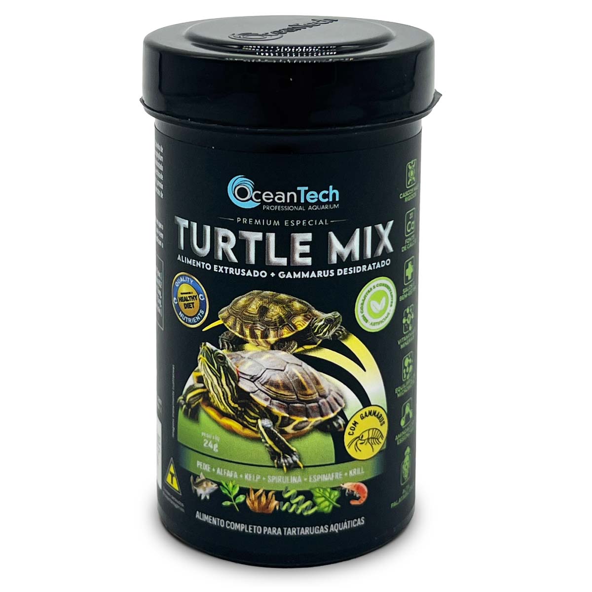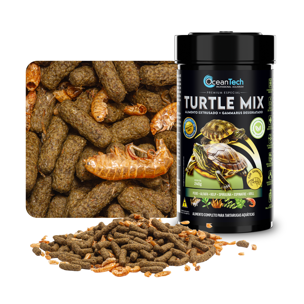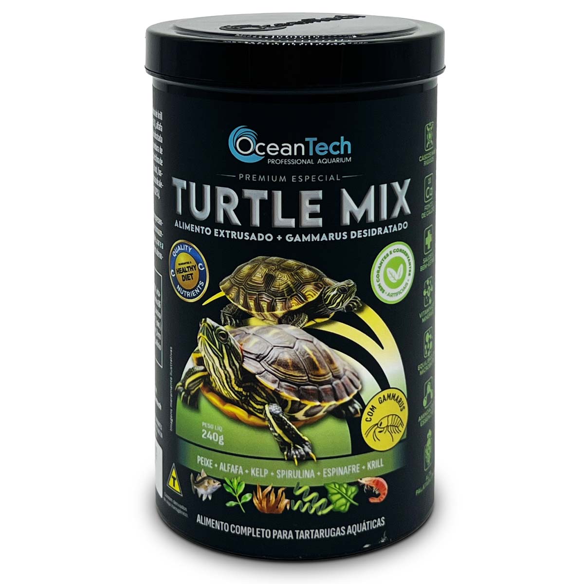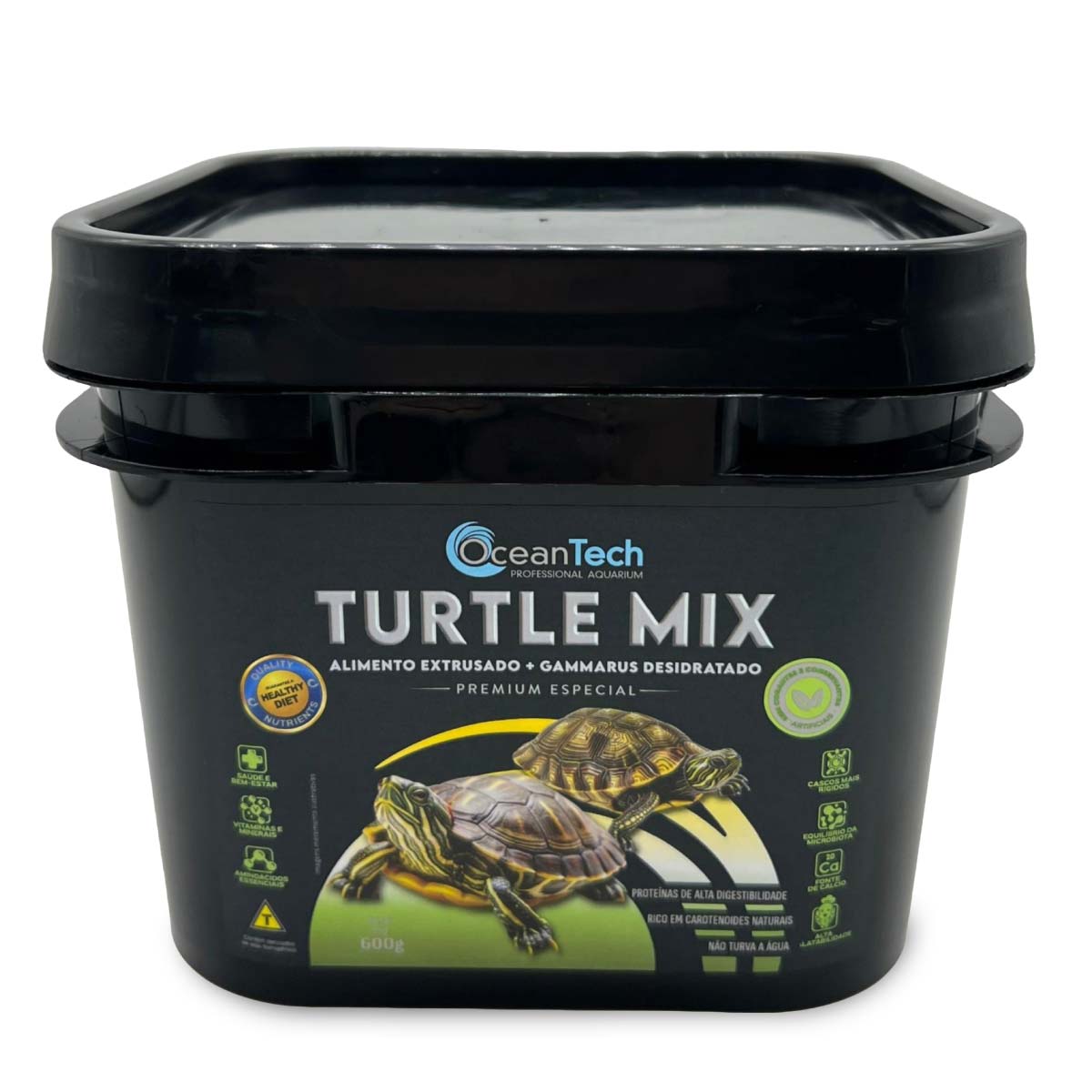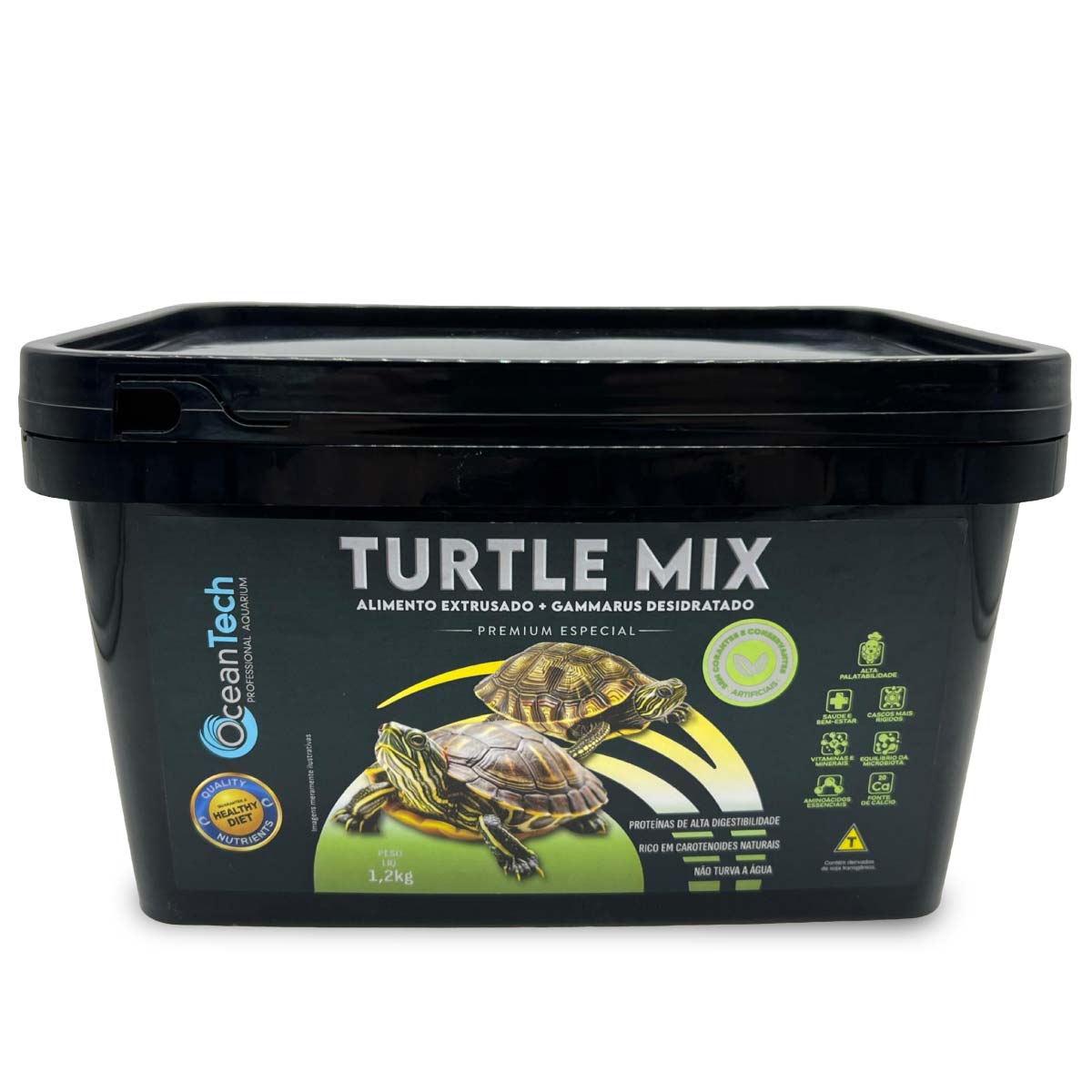OceanTech TURTLE MIX é um alimento balanceado e altamente palatável, desenvolvido para atender às necessidades nutricionais das tartarugas aquáticas. Livre de corantes e conservantes artificiais, é enriquecido com cálcio para garantir carapaças fortes e uma vida saudável. Sua fórmula, com proteínas de alta digestibilidade que ajudam a manter a qualidade da água, gerando menos resíduos no aquário.