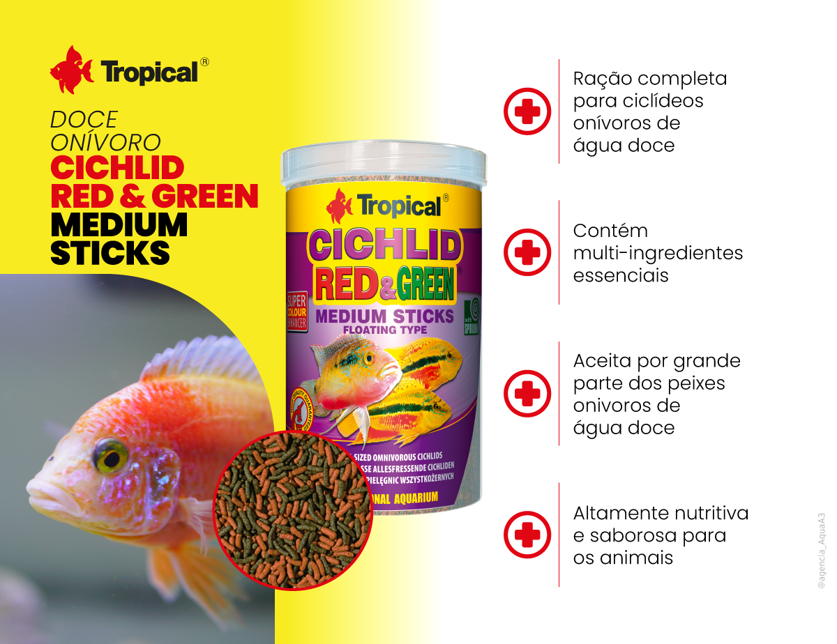 CICHLID RED & GREEN é um alimento completo na forma de sticks flutuantes, para a alimentação diária de ciclídeos omnívoros de tamanho médio. Dois tipos de sticks asseguram uma dieta variada e rica. Os sticks verdes são uma fonte valiosa de algas Spirulina platensis, que, juntamente com fibras, regulam o processo digestivo. Os sticks vermelhos são uma fonte de proteínas animais e astaxantina, que promovem a coloração dos peixes. O estimulante da imunidade natural BETA-1,3/1,6-GLUCAN, a vitamina C e as substâncias ativas encontradas na spirulina aumentam a resistência a doenças.