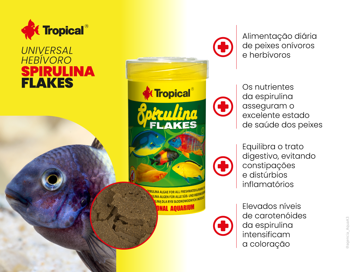 Flocos com alto teor de Spirulina para peixes herbívoros